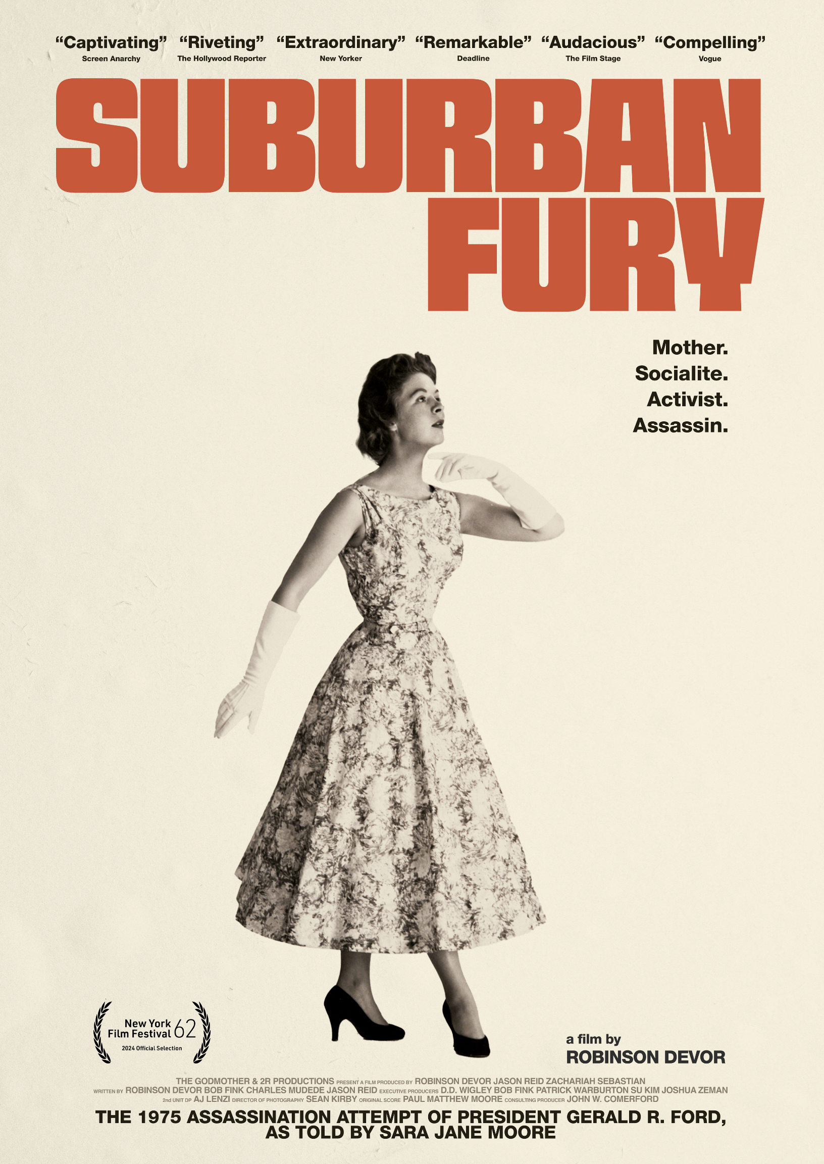 A riveting and compelling portrait of a failed assassin who also happened to be a mother, socialite, activist, and spy. In 1975, suburban housewife Sara Jane Moore attempted to assassinate U.S. President Gerald Ford. Shadowed by the Secret Service, acclaimed auteur Robinson Devor conducts an unprecedented and chilling exploration of how a seemingly ordinary citizen can be swept into extremism, conspiracy, and violence.
